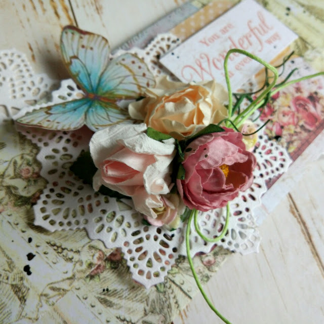 Цветы, бабочка, вырубная салфетка, шнурочек, надпись... пара клякс...